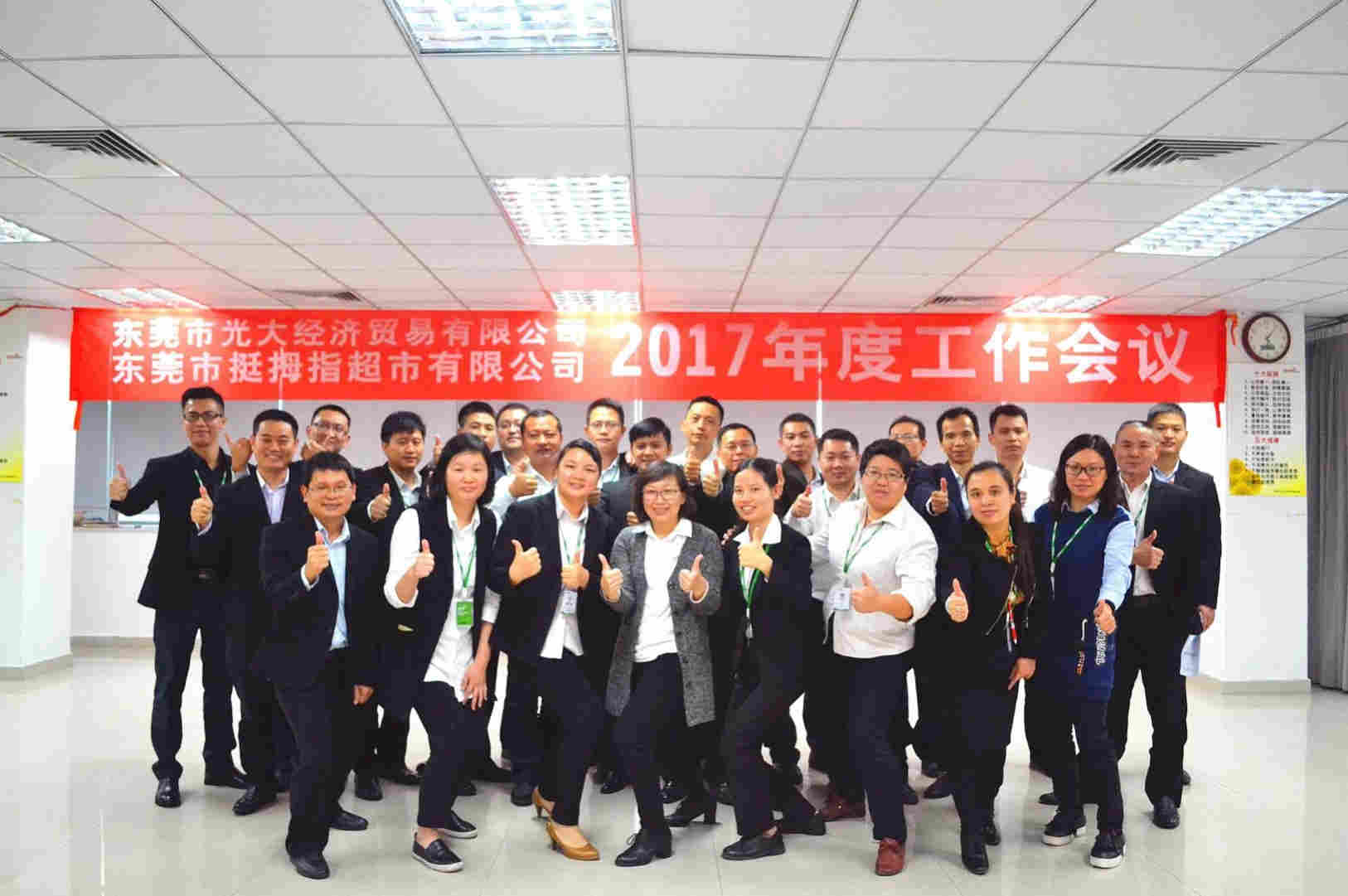 東莞市光大經(jīng)濟貿(mào)易有限公司(挺拇指生活超市)2017年度工作會議于2016年12月19日在光大總部召開,公司常務(wù)副總蓋莉君女士、各職能部門負責(zé)人及各門店店長出席了會議。